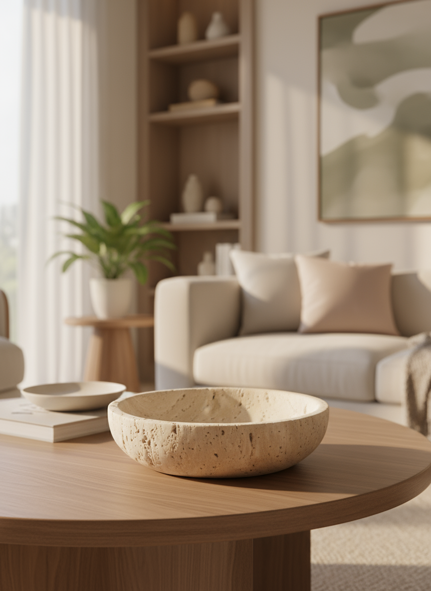 The Arlo Stone Tray is a study in balance, where raw material meets refined design. Each piece is crafted from natural cave stone through a half-handmade, semi-mechanical process that preserves the organic texture and unique character of the stone.