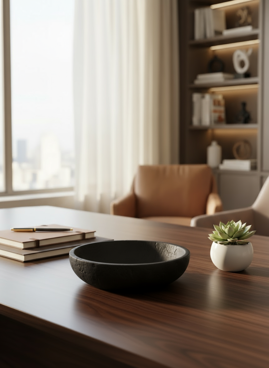 With its rounded geometric form and subtle depth, this modern tray serves as both décor and functional art. Perfect for displaying candles, ceramics, or jewelry, it brings a grounded elegance to any living space.